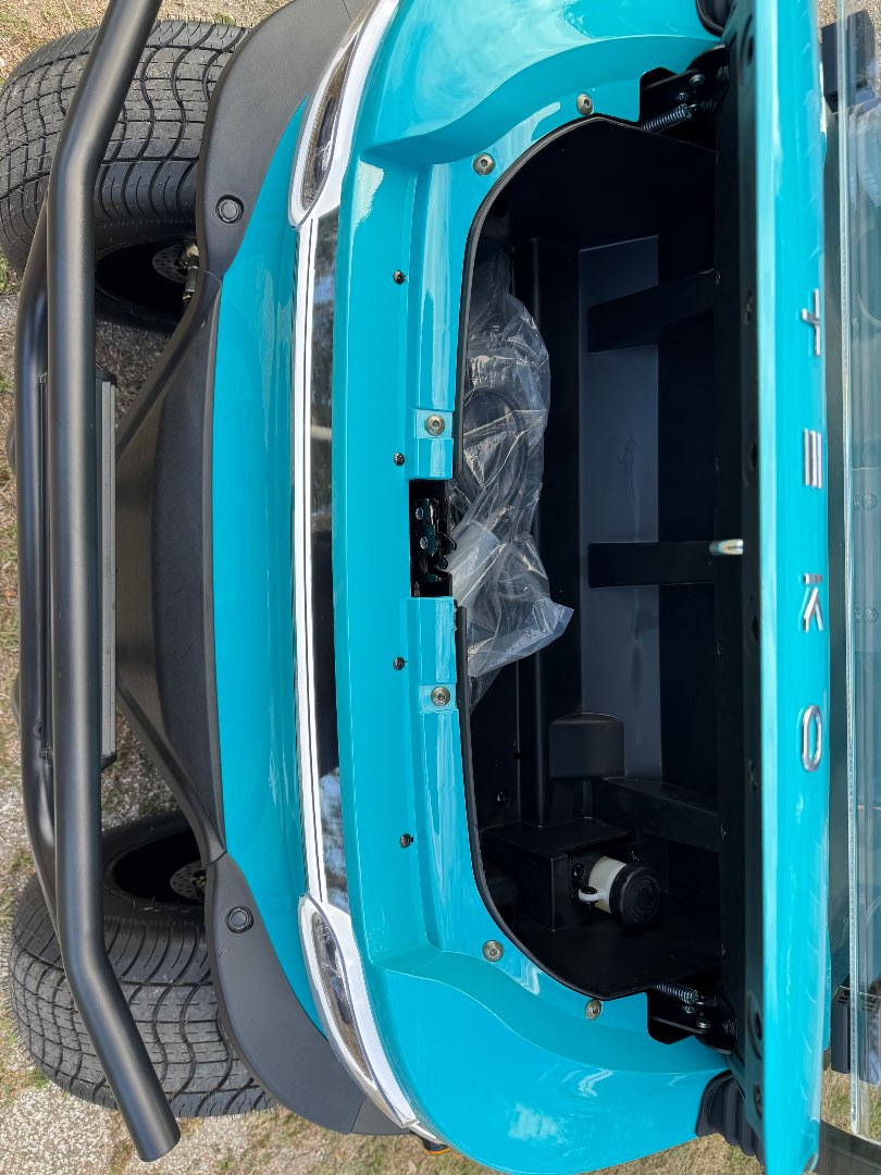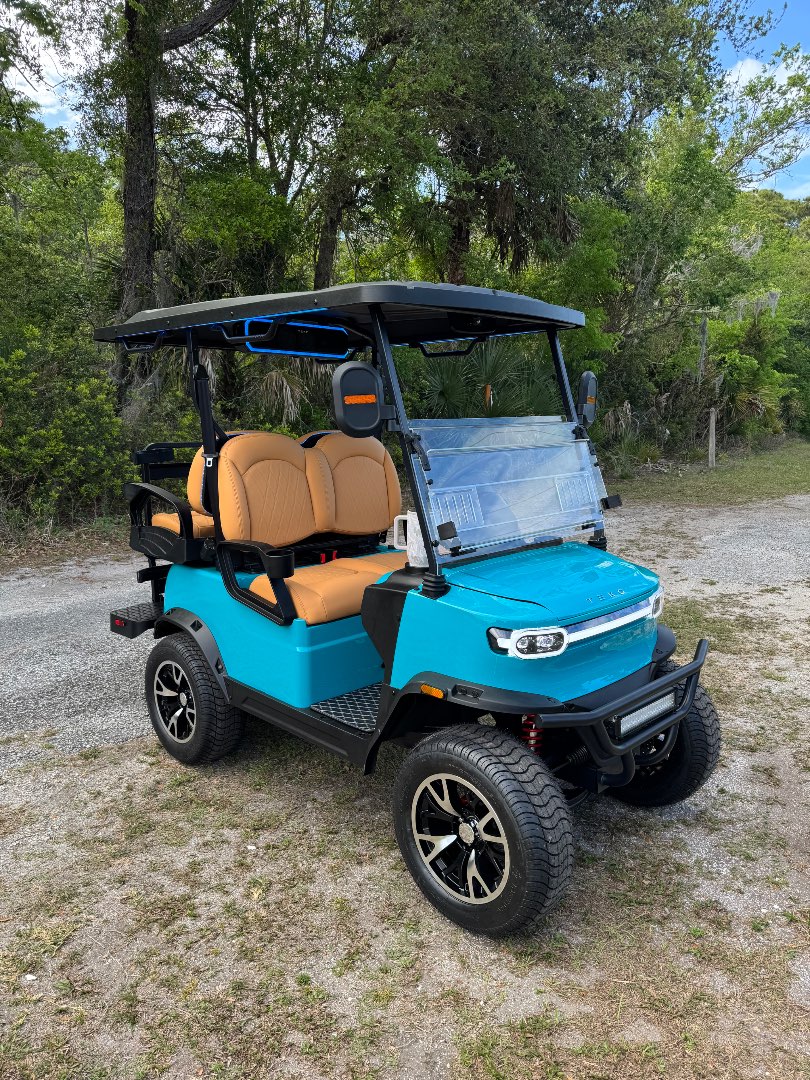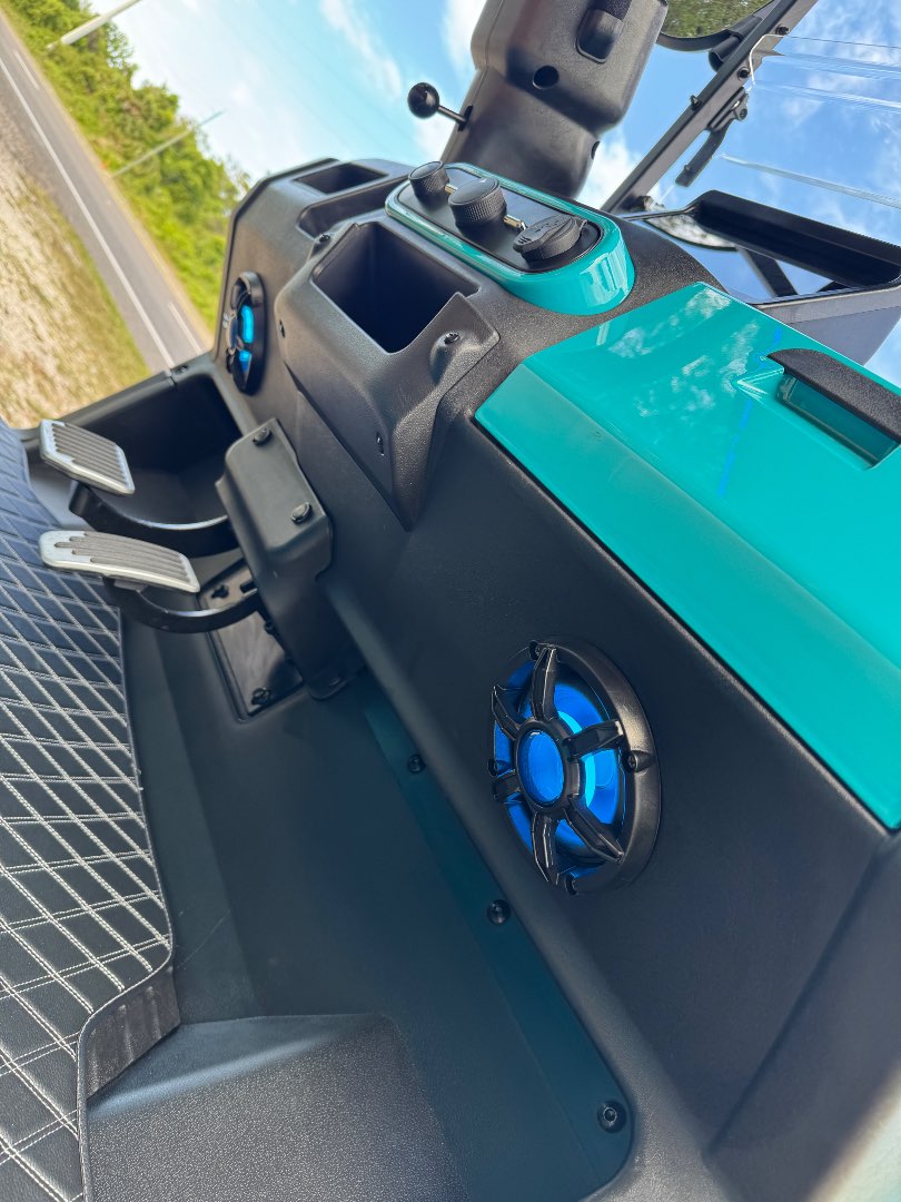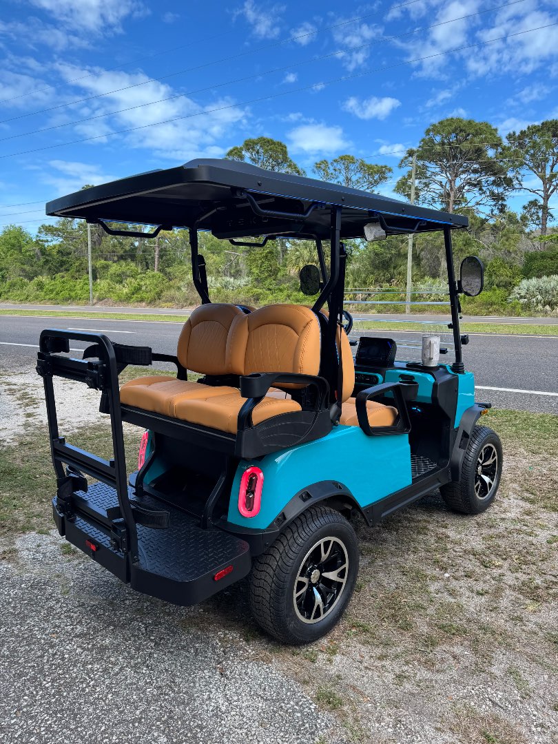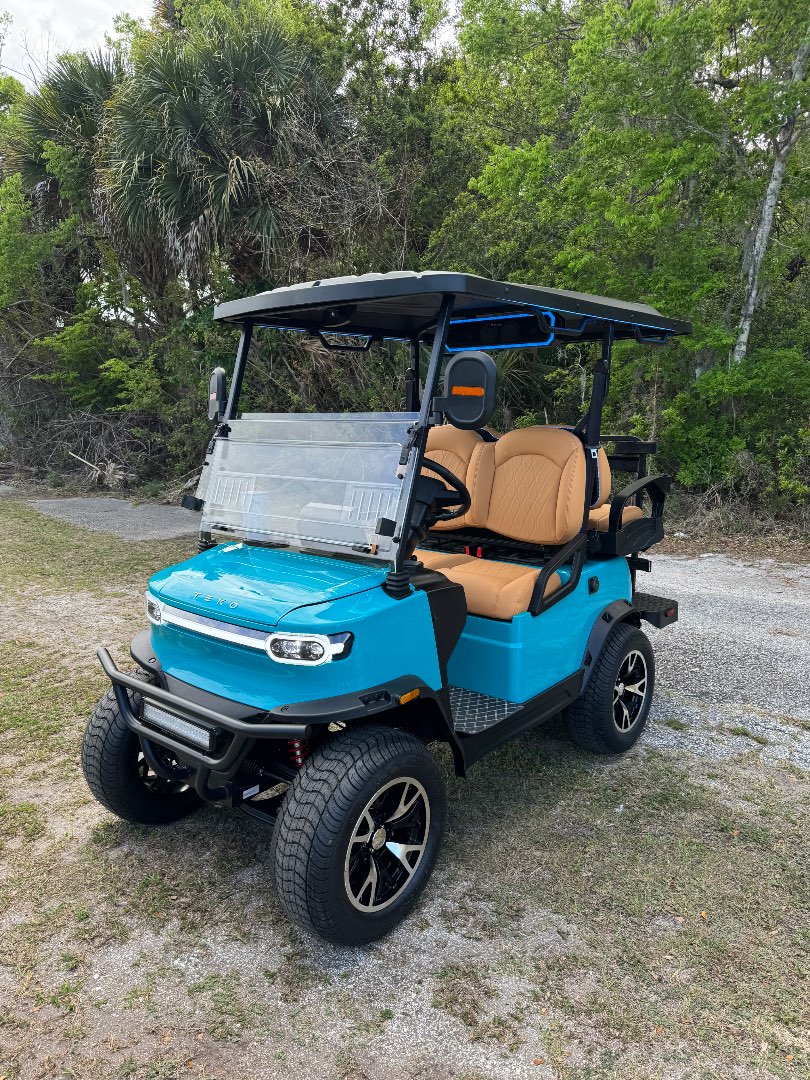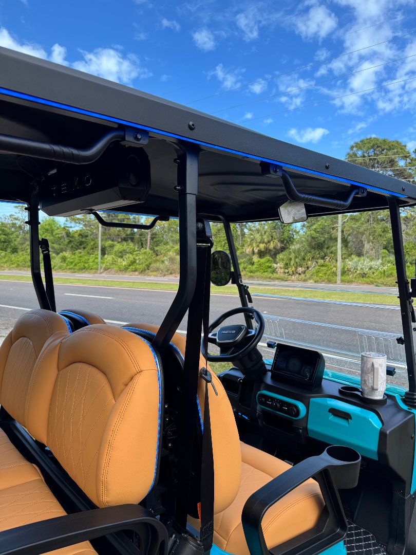 The TEKO Turbo is designed for both performance and comfort, featuring advanced safety and luxury amenities like a backup camera, Bluetooth audio, and ambient LED lighting, making it a top choice for electric golf carts.