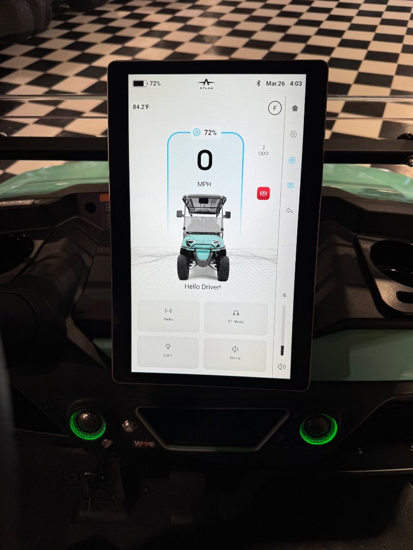 The 2026 Atlas 6P Lifted LSV pairs a 5KW AC Nidec motor with a 210 Ah, 48V Lithium-Ion battery and up to 60 miles of city range.