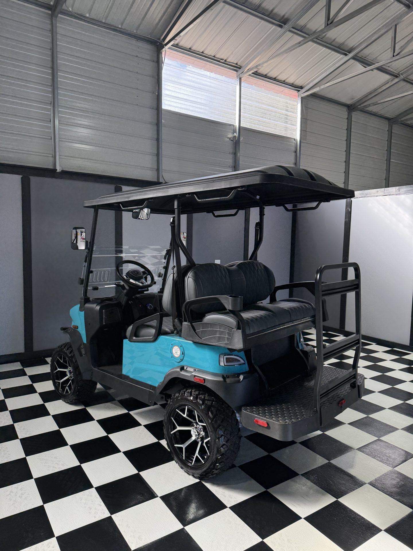 The lifted suspension, 14-inch wheels, and all-terrain tires give the Nomad XL a bold look while allowing it to handle a variety of terrain with ease. Premium diamond-stitched seats, an extended roof, and spacious 4-passenger seating ensure a comfortable ride for everyone.